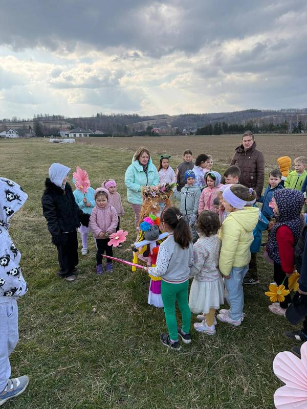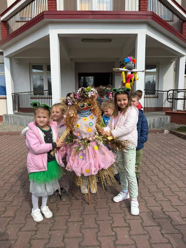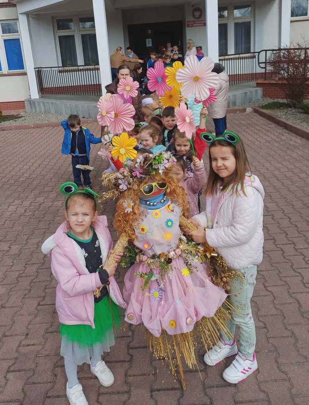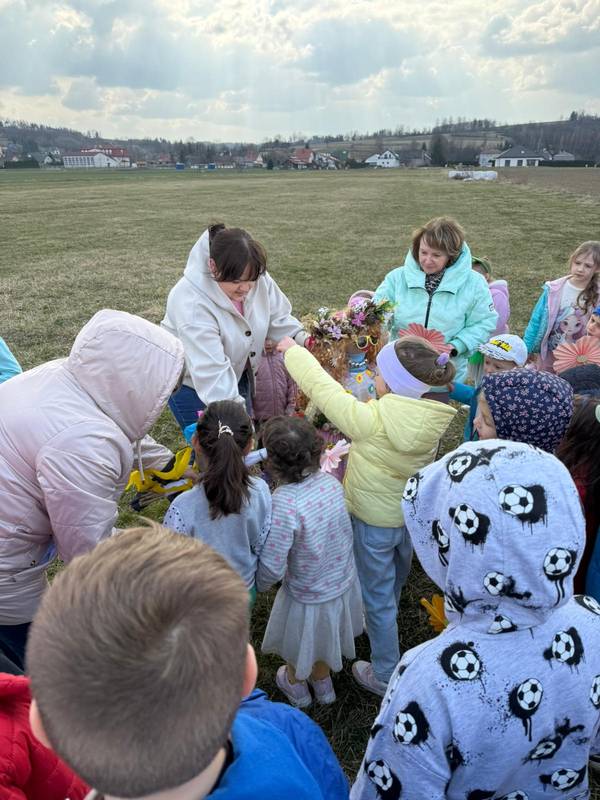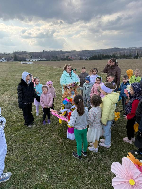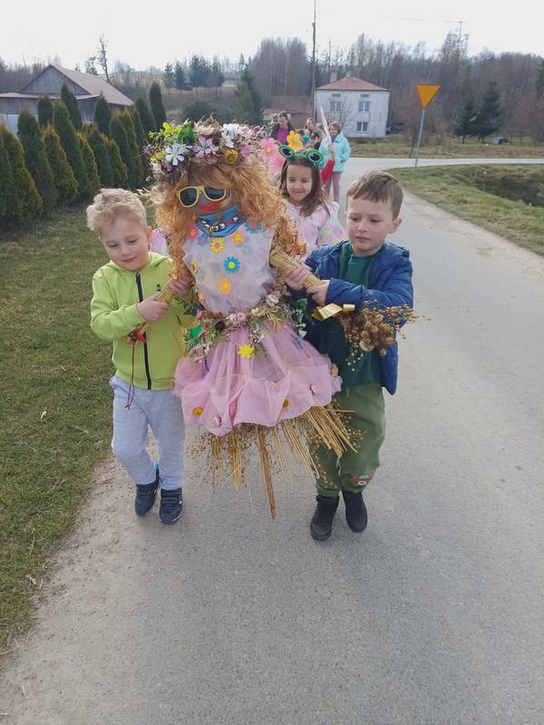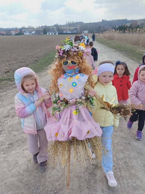Następnie, wraz z opiekunami, dzieci udały się na pobliskie pola, gdzie zgodnie z tradycją pozostawiły marzanny, symbolicznie żegnając zimę i witając nadchodzącą wiosnę. Spacer był doskonałą okazją do wspólnej zabawy na świeżym powietrzu oraz integracji uczniów.