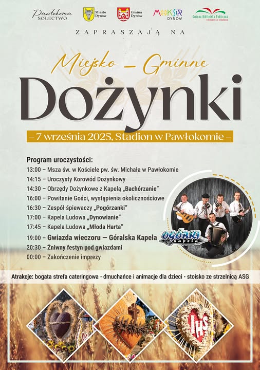 Serdecznie zapraszamy na Miejsko – Gminne dożynki, które odbędą się 7 września 2025 r. w Pawłokomie obok Szkoły Podstawowej. Przyjdźcie całymi rodzinami – będzie to piękna okazja, by razem świętować zakończenie żniw, podziękować za tegoroczne plony i spędzić radosny dzień w gronie sąsiadów i przyjaciół.